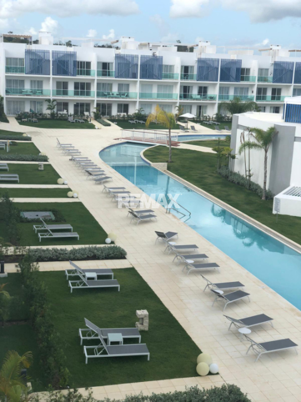 El apartamnto consta de: Sala - comedor, cocina, 2 habitaciones, 2 baños y un amplio balcón privado del que podrás disfrutar de las vistas impresionantes de los jardines tropicales. Cuenta con 1 parque para vehículo y 1 parqueo para carro de golf. El apartamento se vende totalmente amueblado, incluyendo 3 A/C.